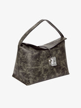 Handbag featuring a T-shaped body, crafted from grey leather with a worn-effect finish. It includes a leather handle, tonal stitching, and dual overlapping flaps adorned with a 3D embossed logo nut in matte nickel finish. The interior is lined with black jacquard and includes a leather patch with a heat-stamped logo. Additionally, there is an internal open pocket made from the lining. Inside the bag, there is a metal chain featuring the GCDS logo.