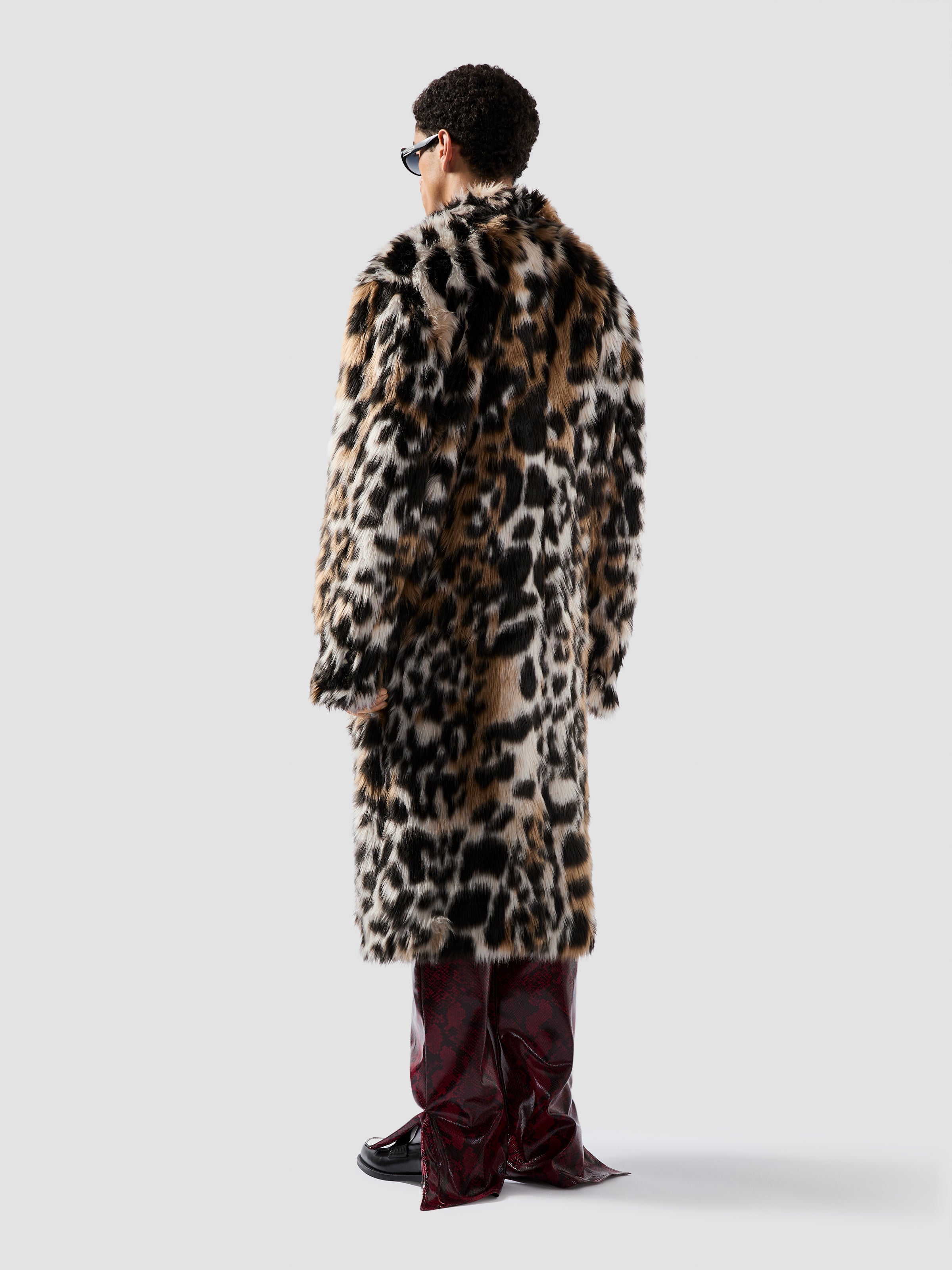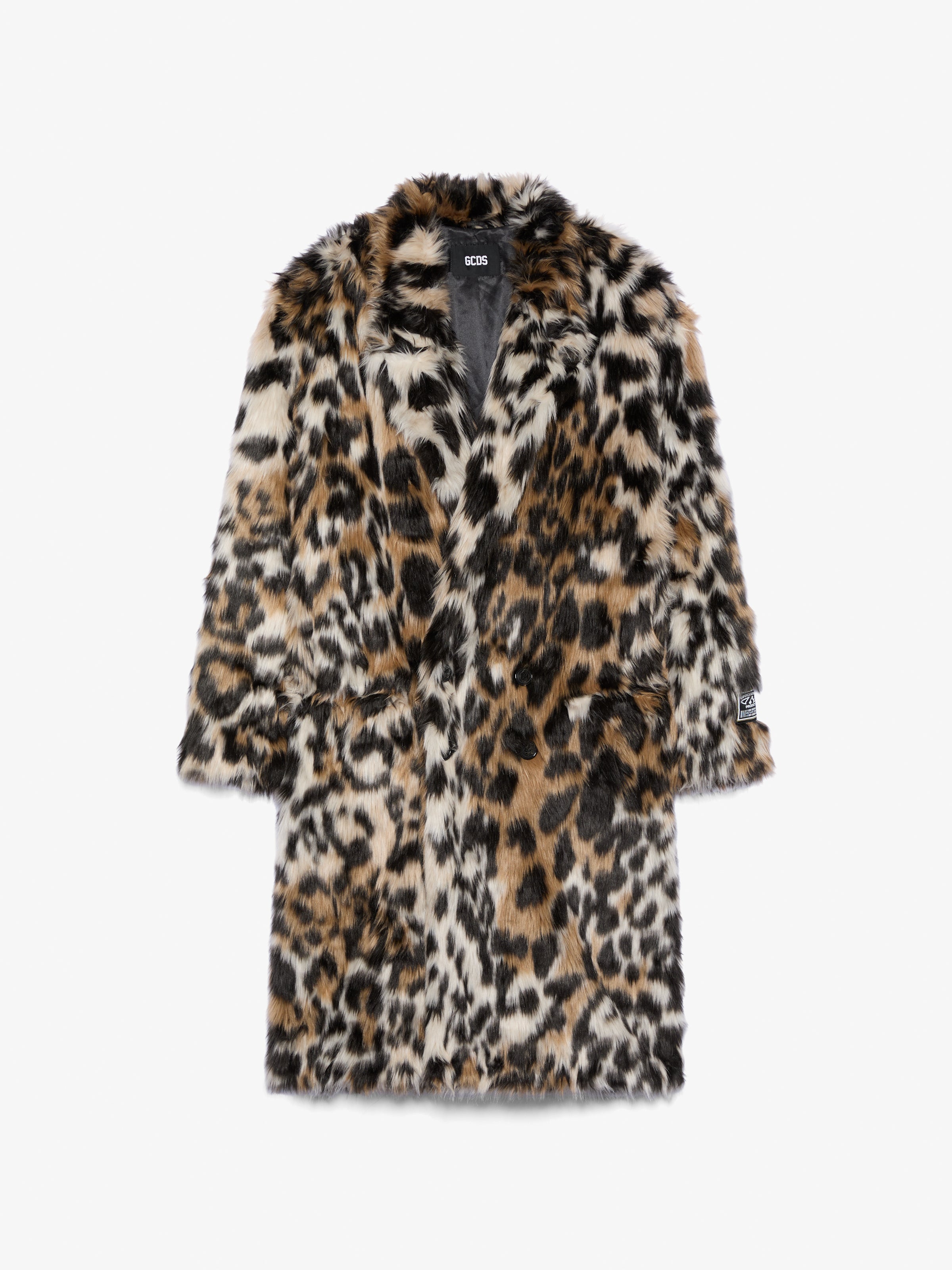 Long faux fur coat with animalier pattern. Features a straight cut, classic notch lapel, double-breasted button closure, and full lining for added comfort.