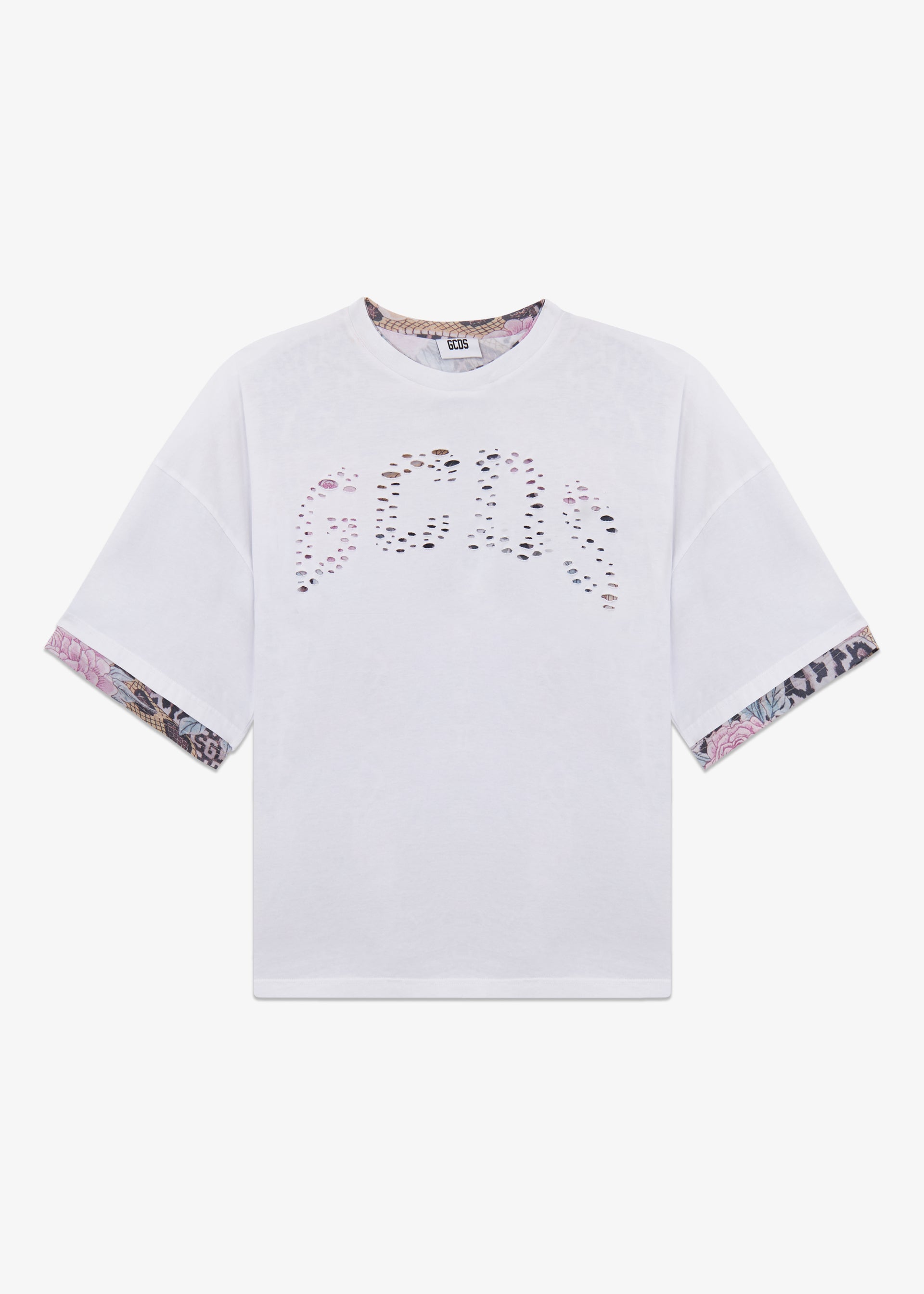Short-sleeve cotton jersey T-shirt with laser-cut GCDS logo on the front. Oversized fit, wide sleeves, and contrast print visible on the turned-up hems.