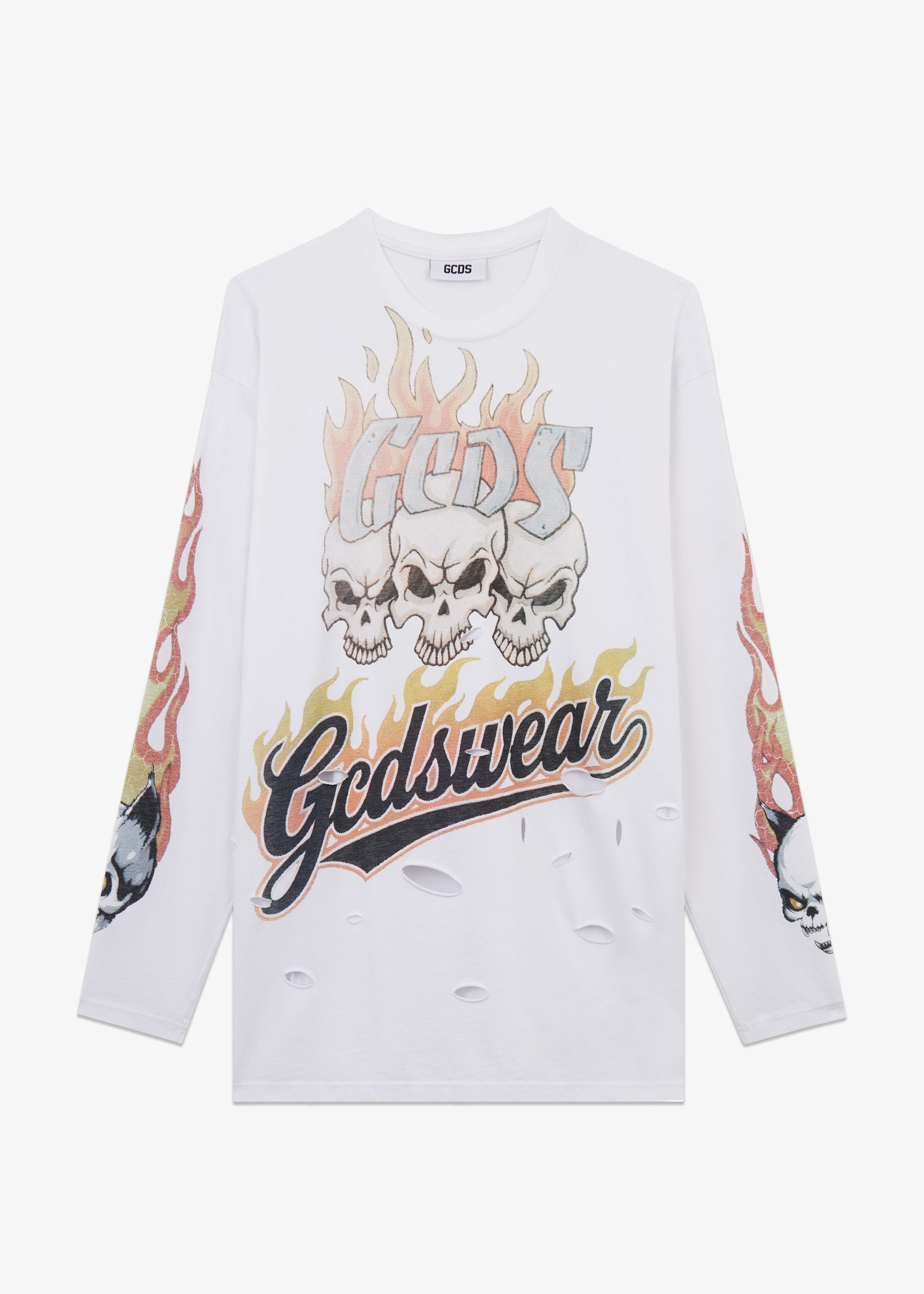 Long-sleeve cotton T-shirt with “Riders” used-effect print on the front, featuring skull and flame graphics and integrated GCDSWEAR logo. Ribbed crew neck, regular fit.