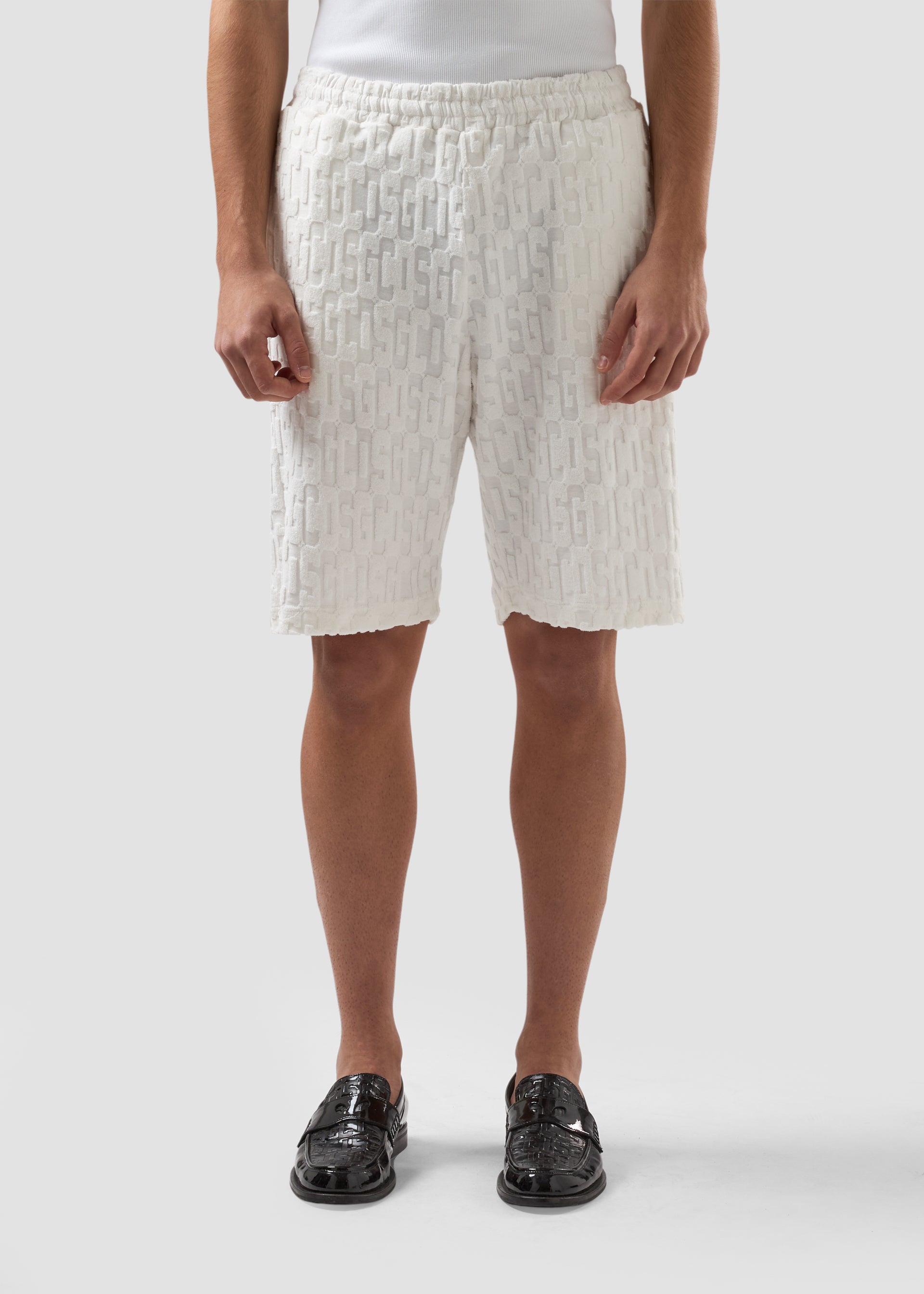 Jacquard terry-effect shorts with all-over GCDS monogram. Elasticated waistband, side pockets, welt back pocket, and tone-on-tone logo detail.