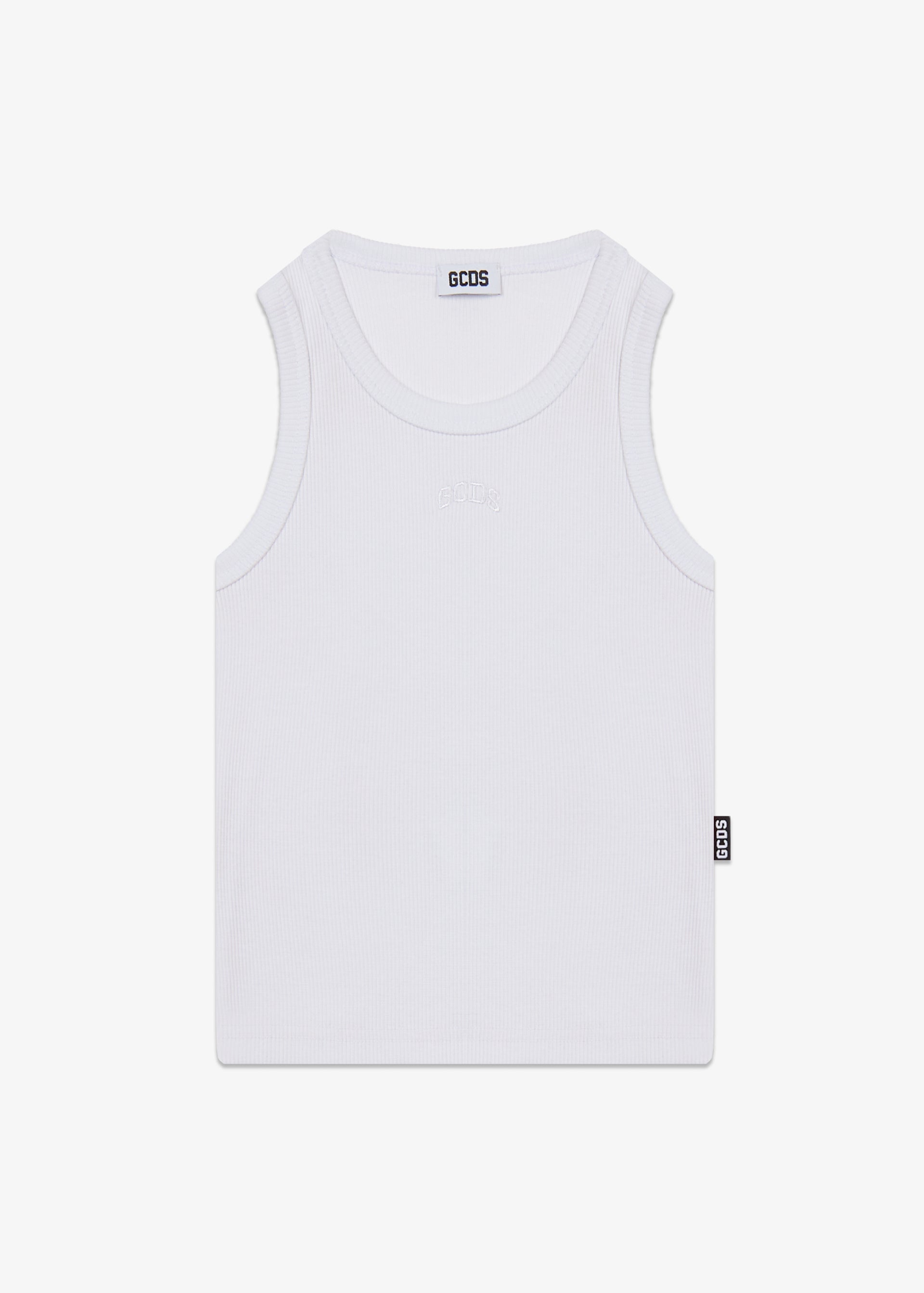 Canotta in misto cotone elasticizzato a costine. Il modello presenta maniche a giro, girocollo e micro logo GCDS ricamato sul petto tono su tono.